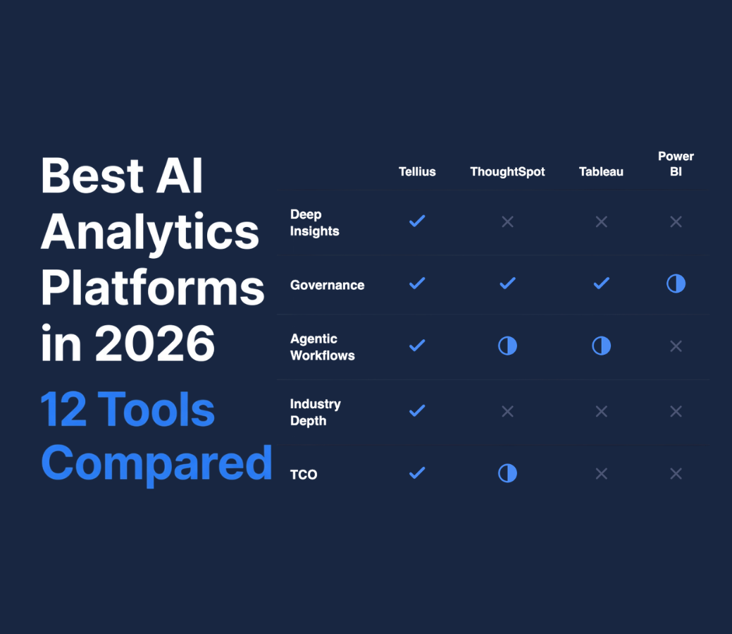 This guide compares 12 AI analytics platforms in 2026 across the capabilities that actually separate “chat with your warehouse” from real analytical automation: governed conversational analytics, automated deep insights (root cause decomposition + ranked drivers), proactive monitoring, persistent business knowledge and context, industry specificity, agentic workflow orchestration, and total cost of ownership. It explains the maturity ladder from reactive Q&A to always-on agents that detect anomalies, investigate why metrics changed, and deliver executive-ready narratives and recommendations—then profiles where each platform fits (and where “agentic” claims don’t match reality).