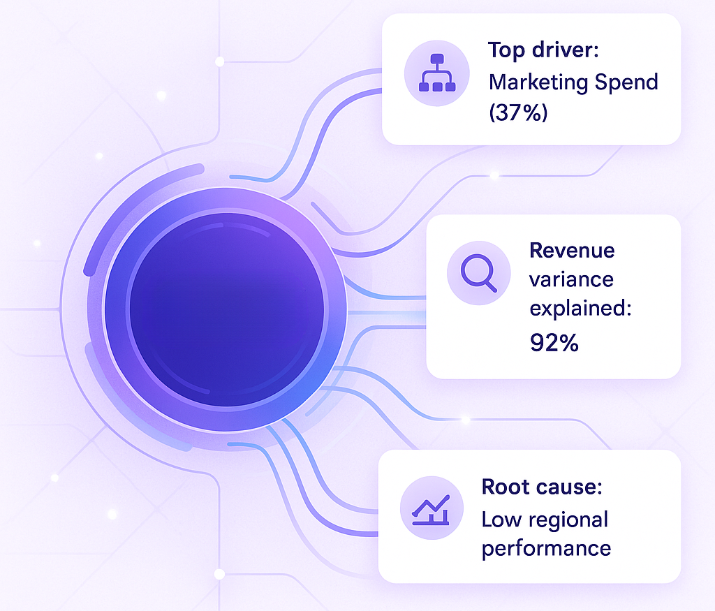 The deterministic insight engine is the AI core of Tellius that ensures explainable, traceable, and reproducible insights across metrics, users, and use cases. Unlike black-box models, Tellius applies consistent logic to diagnose metric changes, detect anomalies, and simulate outcomes—while still allowing flexibility in query inputs.