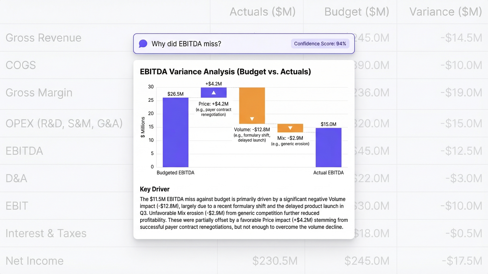 AI-powered financial analytics is transforming how finance teams analyze performance, forecast outcomes, and explain business results. Instead of relying on manual spreadsheets and static dashboards, modern AI analytics platforms use machine learning, natural language interfaces, and automated analysis to uncover the drivers behind financial metrics in seconds. This guide explains how AI-powered financial analytics works, the core technologies behind it, and how finance teams use it for tasks like variance analysis, forecasting, anomaly detection, and executive reporting. It also explores how AI shifts finance from reactive reporting to proactive, insight-driven decision-making by automatically identifying trends, investigating root causes, and generating clear explanations of what’s impacting business performance.