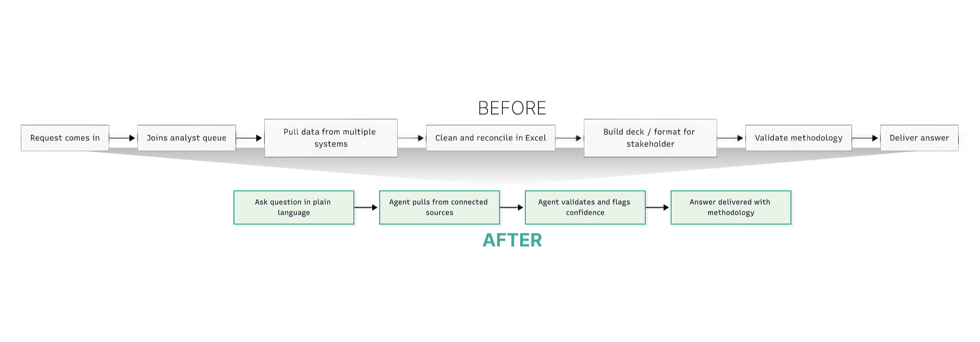 Effective commercial insights teams are rethinking what their analysts and team members spend time on. Instead of wrangling exports and reconciling data sources, they're offloading the investigative grunt work to agentic AI—systems that pull data across sources, validate what they find, and surface answers while the question still matters.