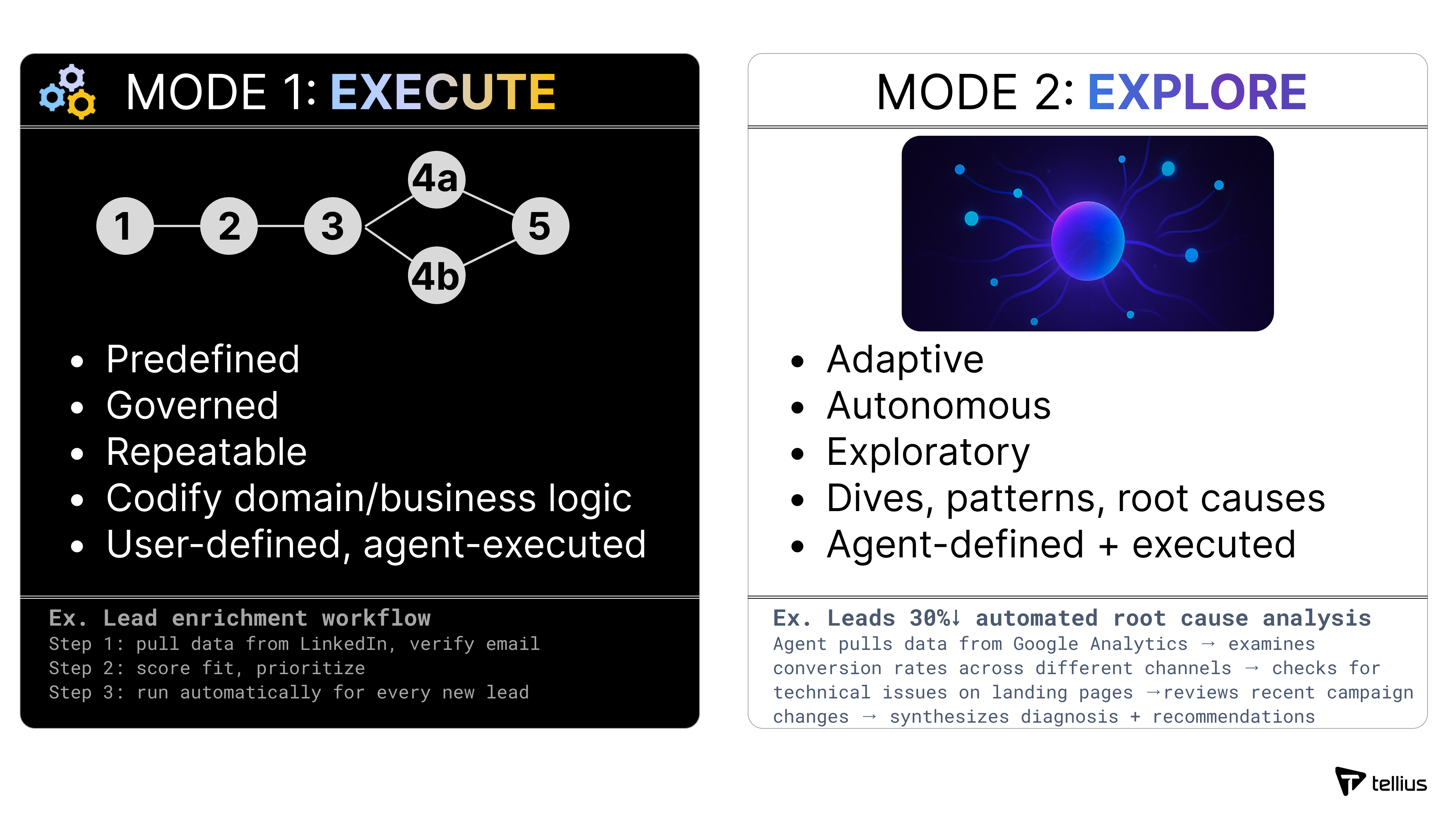 Mode 2: Explore (Agent-first) This is for problems you're still figuring out. Deep dives. Strategic questions. Diagnostics. Here, you don't want to define the steps—you want the AI to reason through the problem, determine what information it needs, and figure out the approach.
