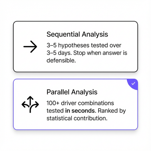 When analysts test hypotheses manually, they typically examine 3-5 possibilities before finding an answer they can defend. AI tests dozens or hundreds of combinations—including dimensional intersections that explain variance more precisely than single-dimension analysis.