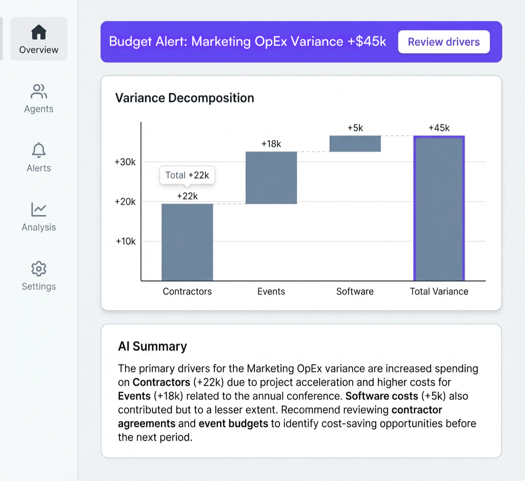 An agent monitors Marketing OpEx against budget. Halfway through Q2, spend trends 15% over plan. The agent doesn't wait for close week. It investigates automatically, identifies drivers, and sends an alert: