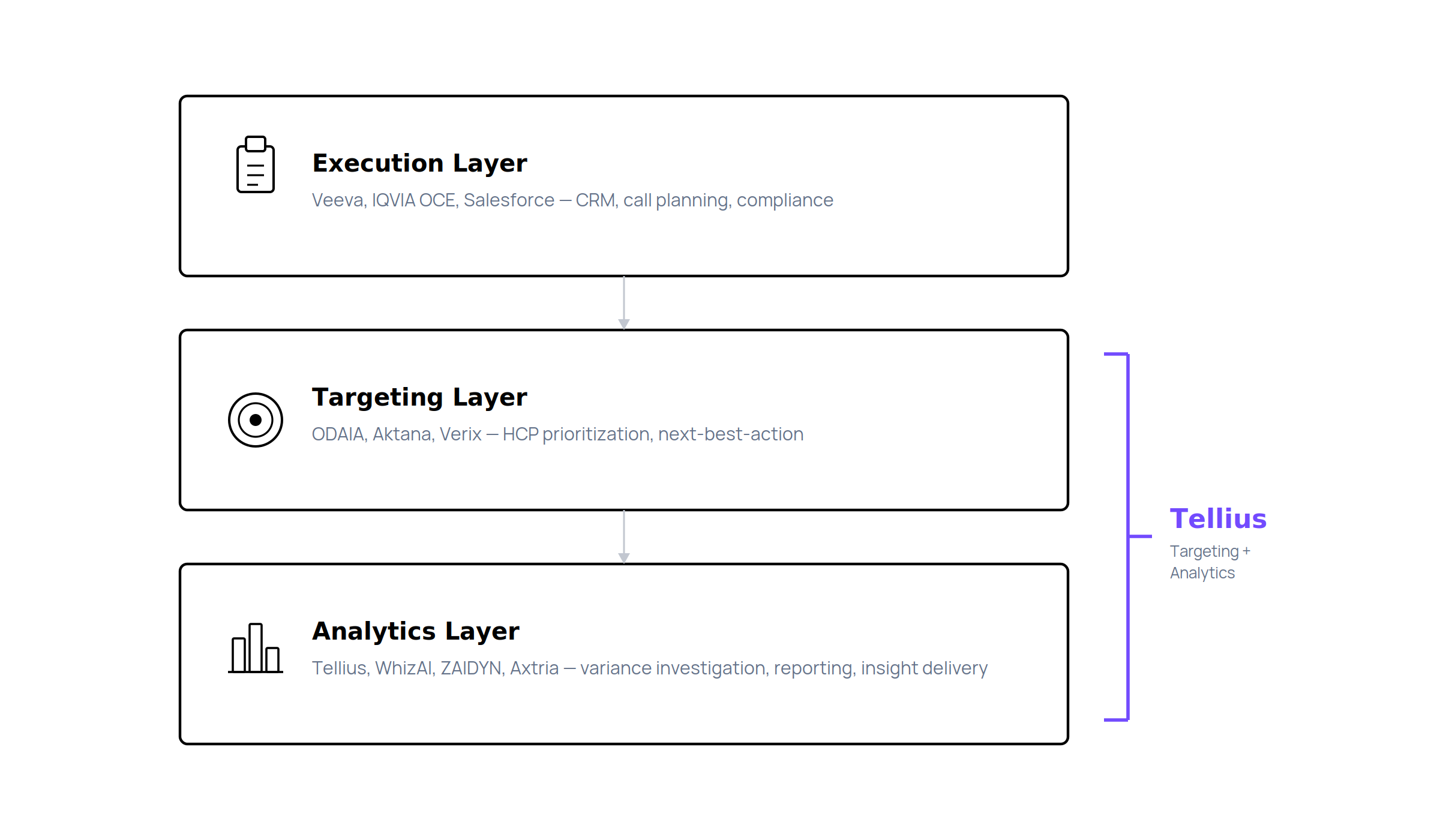 The platforms in this guide fall into three layers. The execution layer is where reps work: Veeva Vault CRM, IQVIA OCE, Salesforce Life Sciences Cloud — call planning, sample tracking, territory management, and increasingly AI-powered pre-call prep. The targeting layer optimizes who to engage: ODAIA, Aktana/PharmaForceIQ, Verix — dynamic HCP prioritization and next-best-action. The analytics layer explains performance: Tellius, WhizAI, ZS ZAIDYN Augmented Analytics, Axtria Field Intelligence — territory variance, reporting, and insight delivery. General BI platforms like Tableau, Power BI, and Qlik operate beneath these layers — they can display pharma data, but they don't understand it natively or investigate it autonomously.