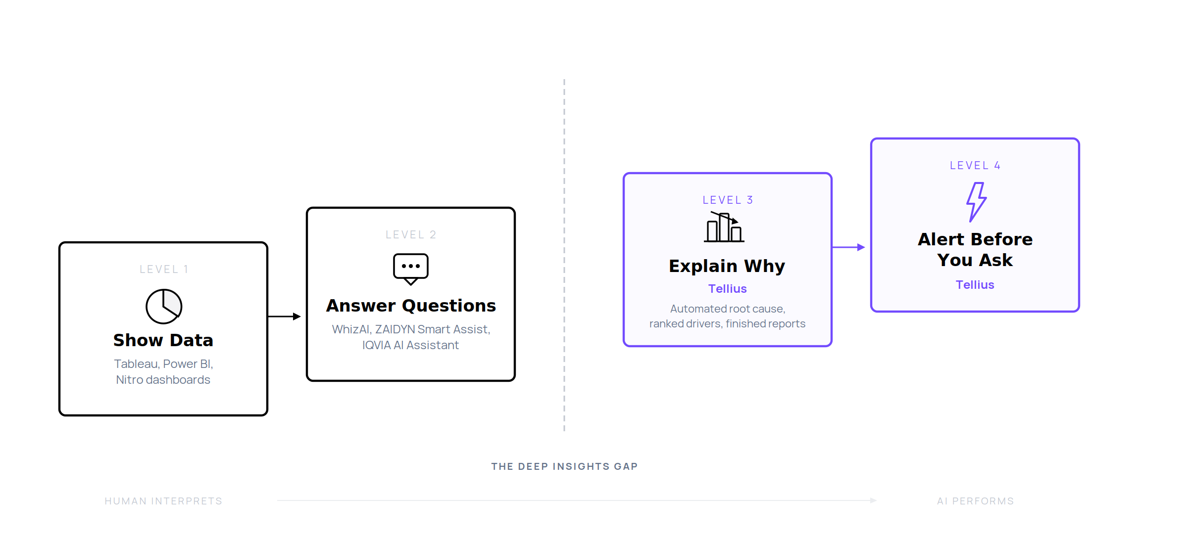 The deep insights gap is the difference between platforms that show what changed and platforms that explain why. Most field force effectiveness analytics stop at Level 2 — answering questions about data. When TRx drops 12% in a territory, Level 2 platforms show the drop and let you ask follow-ups about which territories contributed. Level 3 platforms autonomously investigate the decline, decompose it into ranked contributing factors with quantified impact, and deliver a finished explanation. Level 4 platforms detect the decline before anyone asks and deliver the analysis proactively. Tellius delivers Level 3 and Level 4 capabilities; every other platform in this comparison stops at Level 1 or Level 2 for analytical investigation.