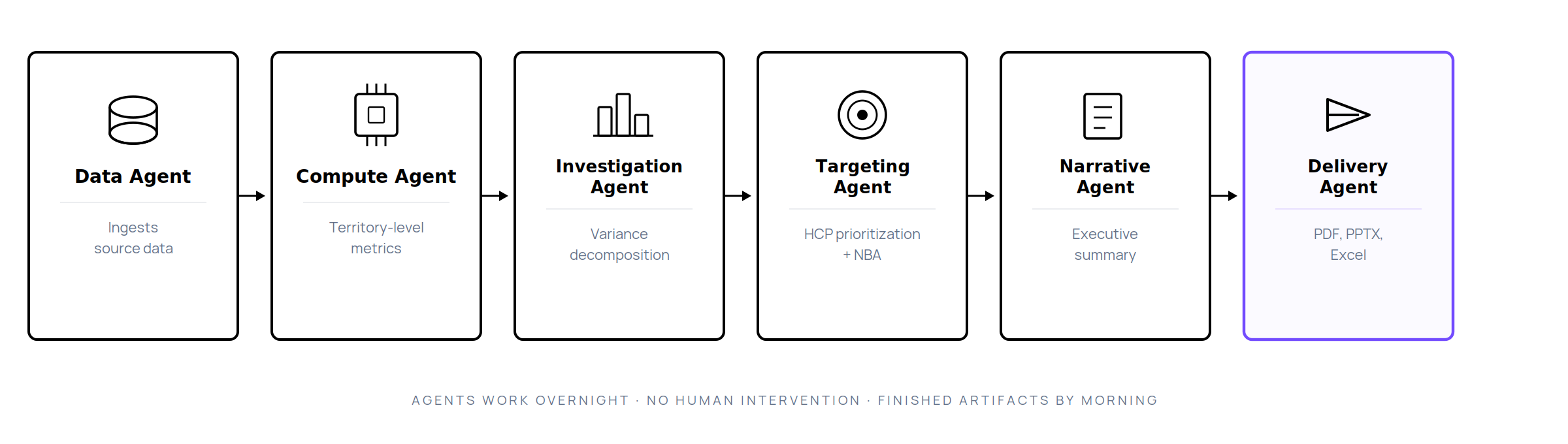 The architecture runs as connected agent pipelines, not isolated queries. A knowledge layer maintains governed definitions for TRx, NBRx, market share, payer hierarchies, and territory structures — so every agent uses your organization's definitions, not generic AI inference. A context layer carries understanding across investigations: a finding from last Tuesday informs this week's proactive alert. Agentic workflows chain agents into repeatable pipelines: a data agent pulls from Veeva and IQVIA, a compute agent builds territory-level metrics, an investigation agent decomposes variance, a targeting agent identifies high-potential HCPs and generates next-best-action recommendations, a narrative agent generates the executive summary, and a delivery agent sends the finished PDF. These agents work for hours — overnight, over weekends, continuously — producing decision-ready artifacts without human intervention.