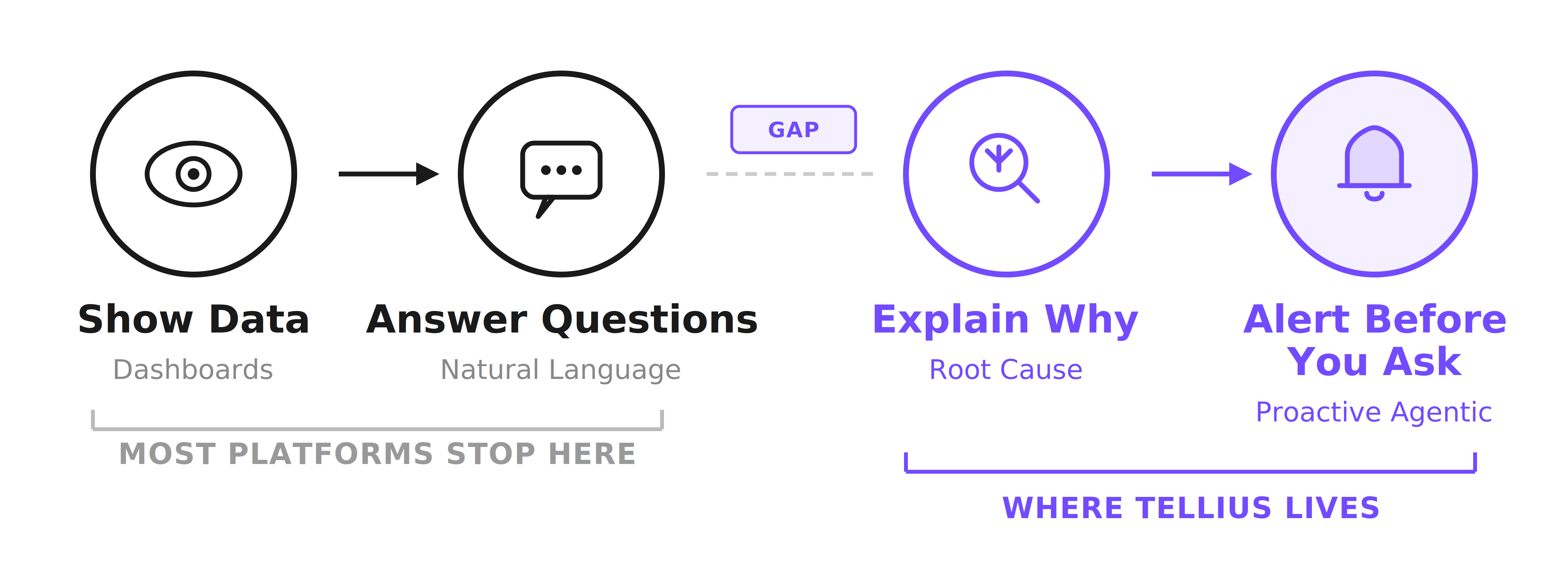 Tellius focuses on the investigation layer: automated root cause decomposition, quantified driver ranking, executive narrative generation, and proactive insight delivery through agentic workflows. Every analysis runs on a governed semantic layer with persistent business context.
