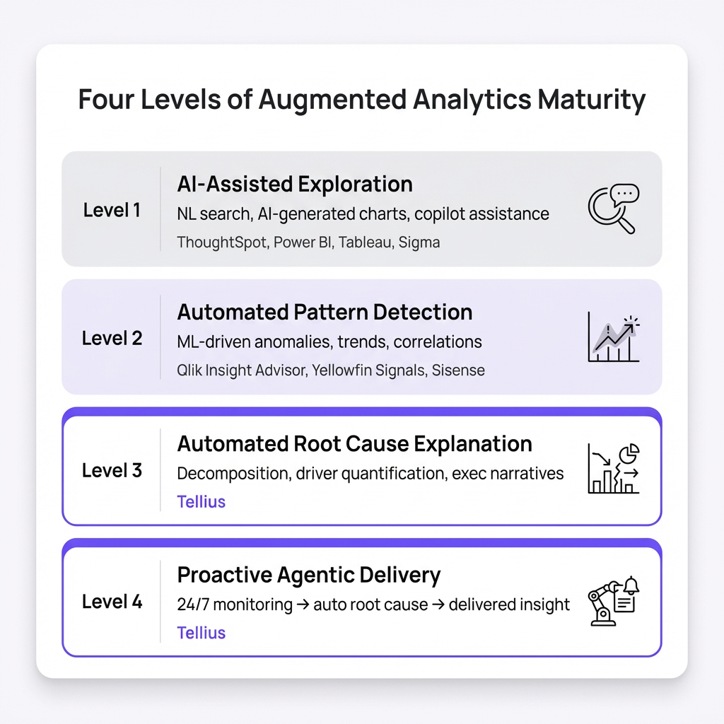 Level 3 — Automated root cause explanation with deep insights. The platform decomposes metric changes into ranked drivers with quantified impact, generates executive summaries, and delivers finished recommendations. Tellius operates at this level.