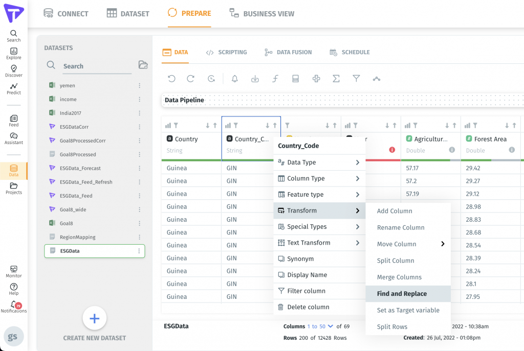 Tellius also have a pretty expansive data preparation layer where we can complete a lot of no-code or low-code data transformations, for example, changing data types, finding and replacing different string values, upper and lower casing text, etc. All these common data preparation can be done in a point-and-click fashion in Tellius.