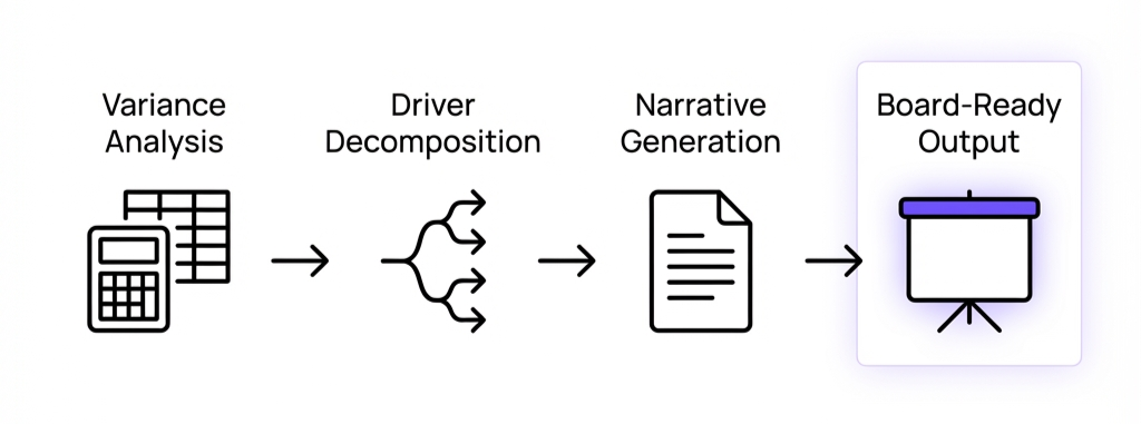 The duplication problem. Analysts investigate variances all week. Then leaders write slides explaining the same variances the following week. Two separate efforts, same underlying numbers. The analysis exists—it just hasn't been translated into prose yet. This handoff costs 3-5 days per cycle.