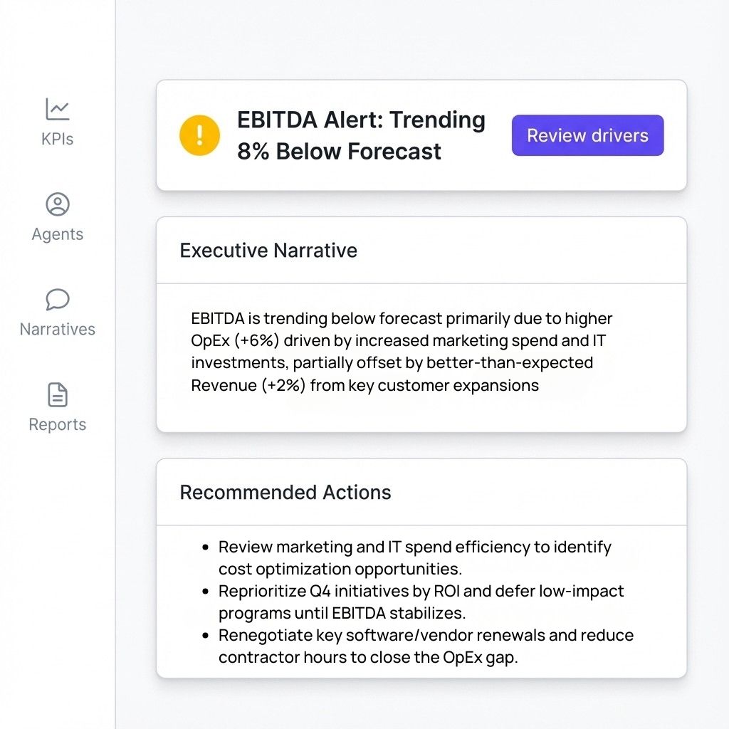 An agent monitors EBITDA performance against the forecast. Mid-quarter, actual run rate trends 8% below plan. The agent doesn't wait for the close. It investigates—decomposing the variance across revenue, COGS, and OpEx drivers. It generates a narrative: