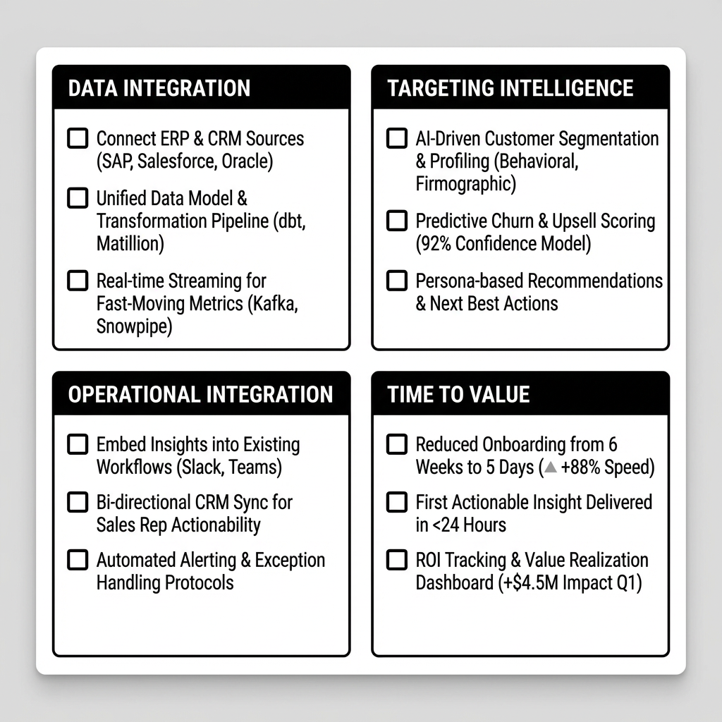 Purpose-built platforms deploy in 8-12 weeks. Weeks 1-3: data connection and identity resolution. Weeks 4-6: model configuration and validation. Weeks 7-10: CRM integration. Weeks 10-12: pilot rollout and tuning. Compare to custom builds (6-12 months) or legacy implementations (12-18 months).