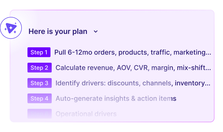 With a predefined workflow, you can codify a full revenue diagnostic for an e-commerce brand (across product mix, customer segments, and the conversion funnel) into a reusable, parameterized analysis that runs automatically when triggered.