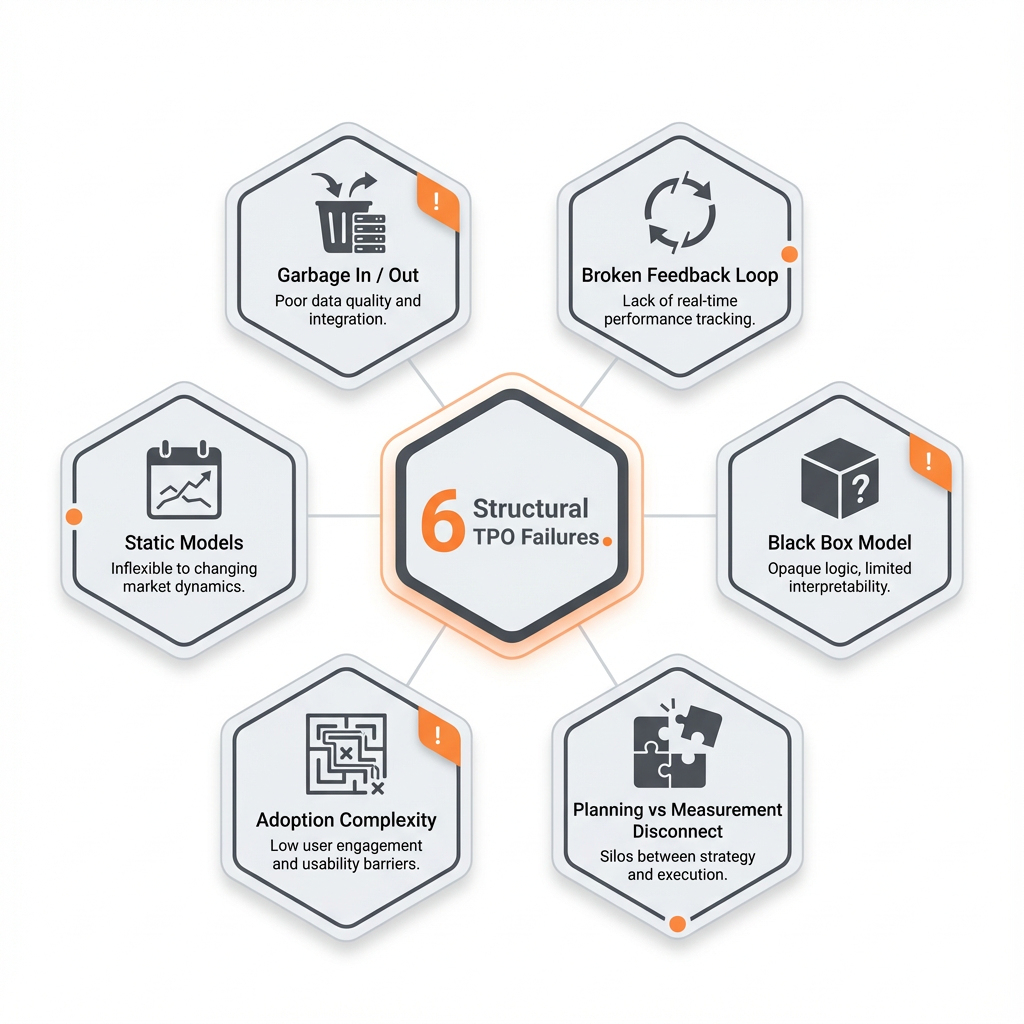 Static models in dynamic markets. TPO models were calibrated at implementation and rarely updated. But promotion response changes—competitive intensity shifts, consumer behavior evolves, retailer dynamics fluctuate. Models trained on 2022 data don't predict 2025 response. AI models retrain continuously as new data arrives—adapting to market changes rather than fossilizing.