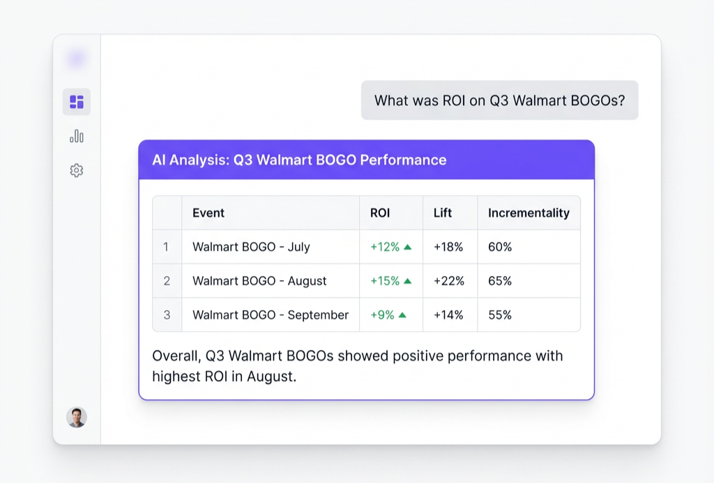 AI-powered trade promotion analytics takes a different approach. It unifies point-of-sale data, syndicated sources, and Trade Promotion Management (TPM) systems to measure promotion effectiveness automatically. Unlike TPM platforms that track planned versus actual spending but not performance impact, AI-powered analytics calculates lift, incrementality, and ROI for every event—identifying which tactics, retailers, and timing windows drive profitable volume versus volume that would have happened anyway.