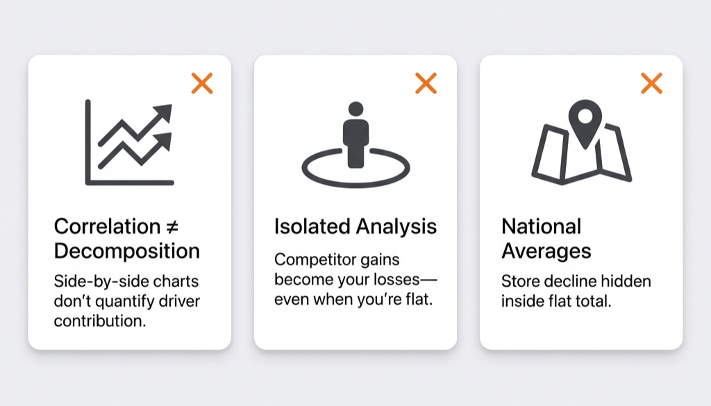 But here's what that process actually delivers: a description, not a diagnosis. You learn that share dropped and that velocity also dropped. You don't learn whether the velocity drop caused the share drop, how much it contributed versus distribution changes, or whether competitive activity was the real driver.