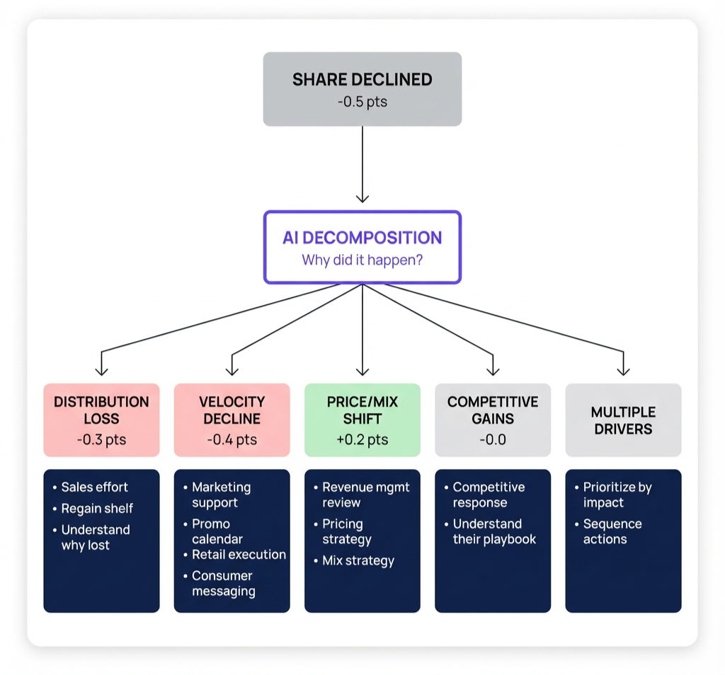 When share drops half a point, AI decomposition breaks it into the five factors that actually moved—and what to do about each.