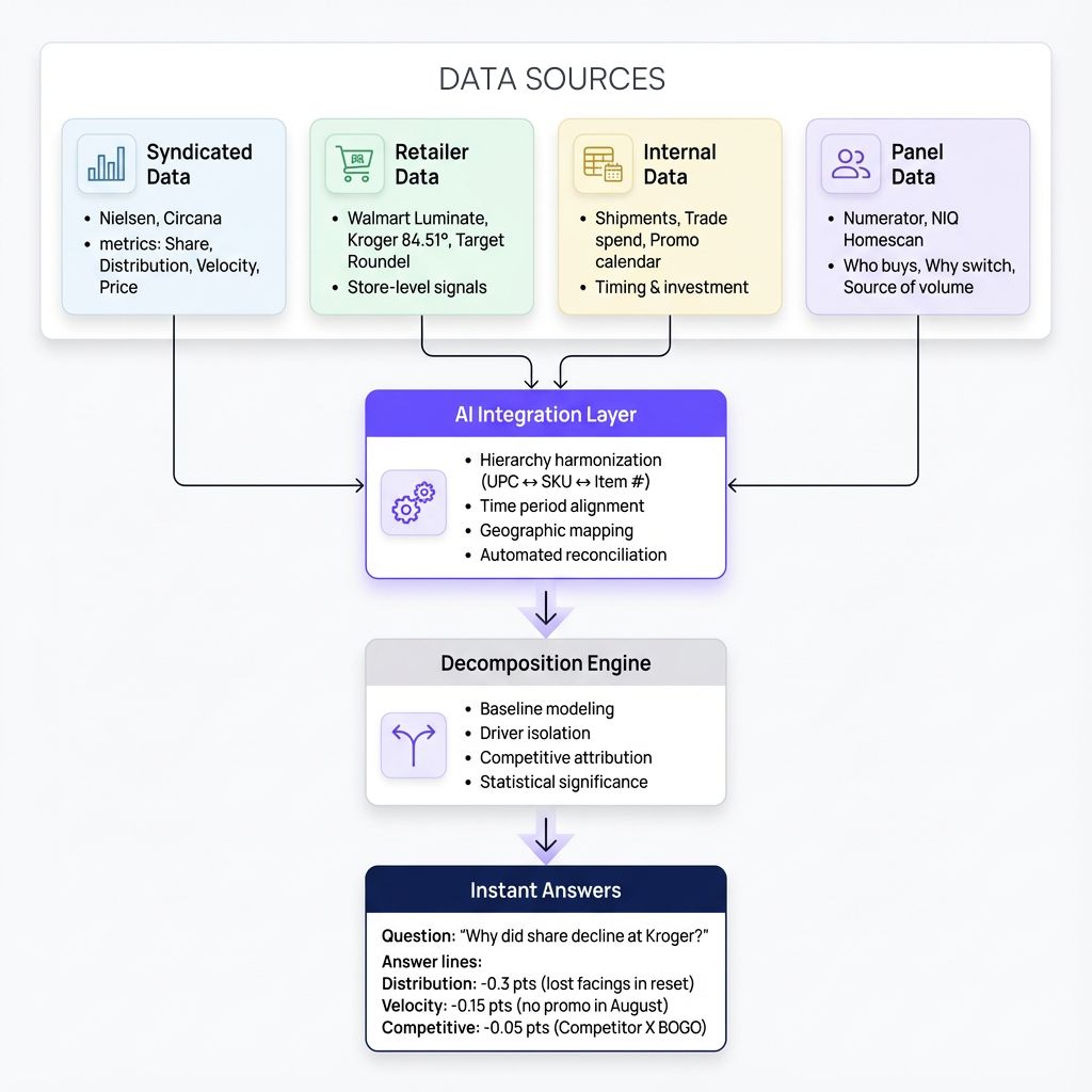 Share decomposition requires integrating multiple data sources: syndicated POS data from Nielsen or Circana, retailer-specific data from Walmart Luminate or Kroger 84.51°, and internal shipment and promotional data. Traditionally, reconciling these sources—which use different product hierarchies, time periods, and geographic definitions—consumes 60-70% of the analysis timeline.
