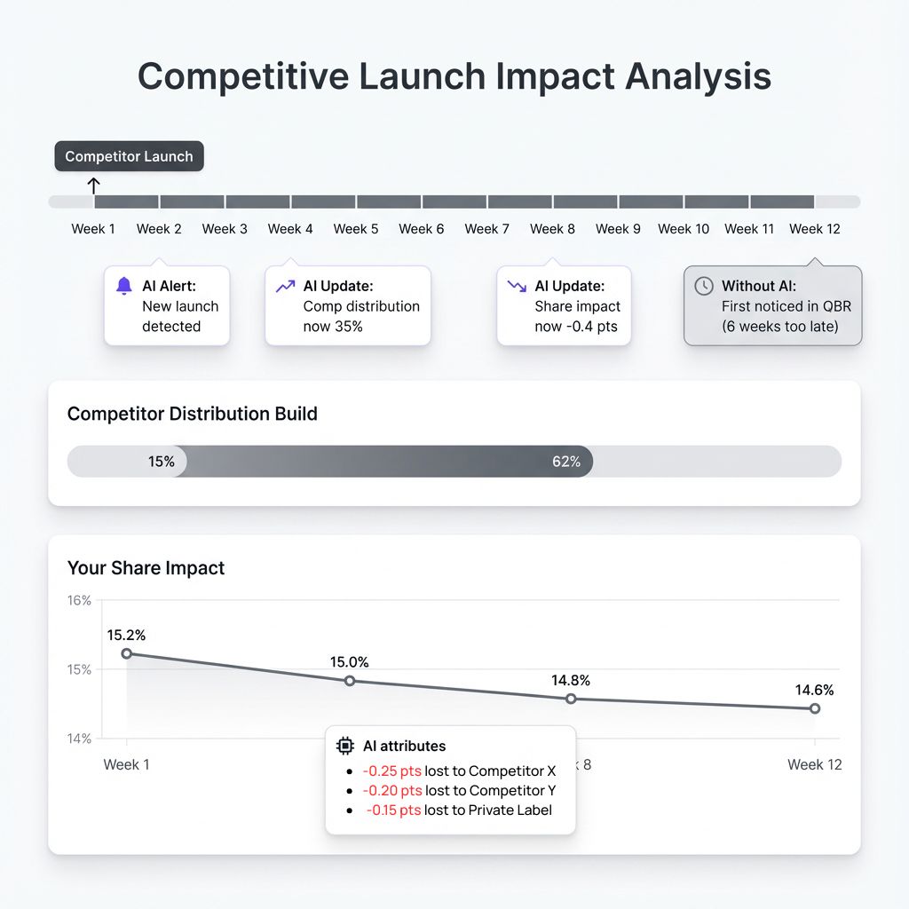 With AI: AI detected the competitive launch immediately and has been tracking its impact continuously. When asked, AI shows: "Competitor launch took 0.6 share points from the category—0.25 from your brand, 0.2 from Competitor Y, 0.15 from private label. Launch velocity is strong and distribution is still building. At current trajectory, expect additional 0.3 point share loss over next two quarters." The brand team can make informed decisions about response: counter-launch, promotional defense, or segment repositioning.