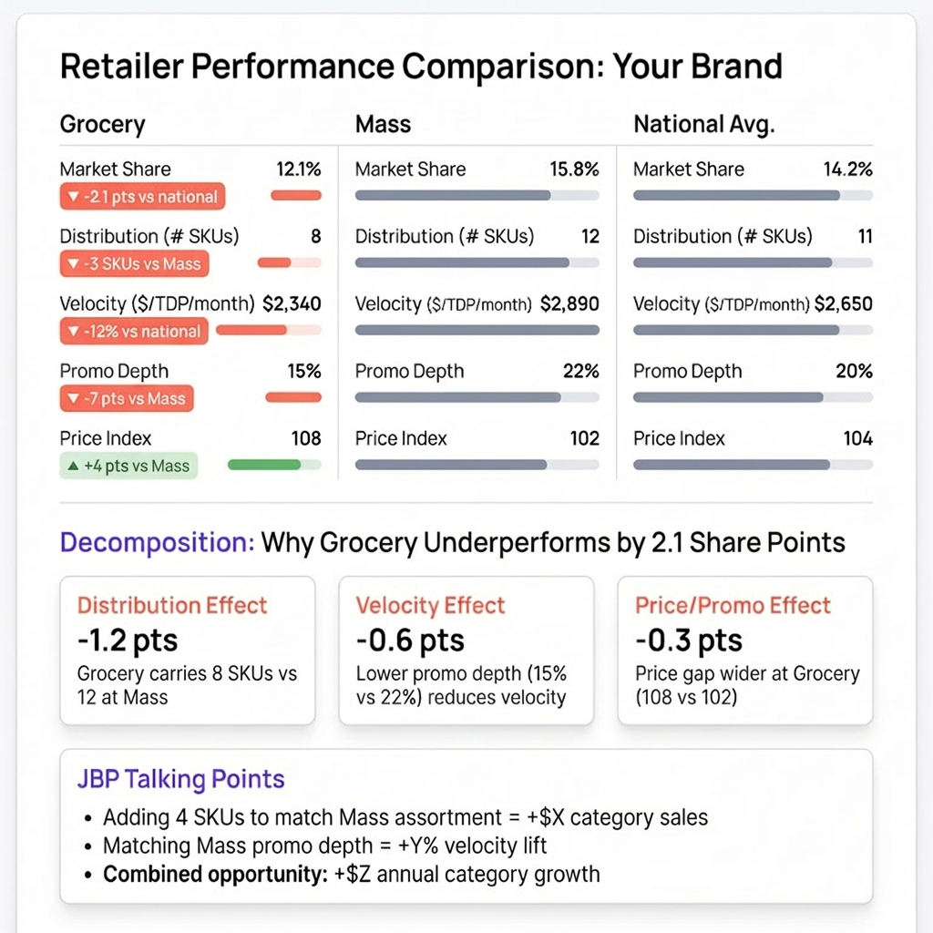 Decomposition transforms retailer conversations from subjective debate to fact-based discussion. Instead of "we need more support," show: "Our velocity at your banner is 15% below national average. Decomposition shows 8% from promotional depth gap (15% discount versus 22% nationally) and 7% from reduced facings versus last year. Matching promotional parity would recover approximately $X in category sales." Specific, quantified insights earn credibility and shift conversations toward solutions.